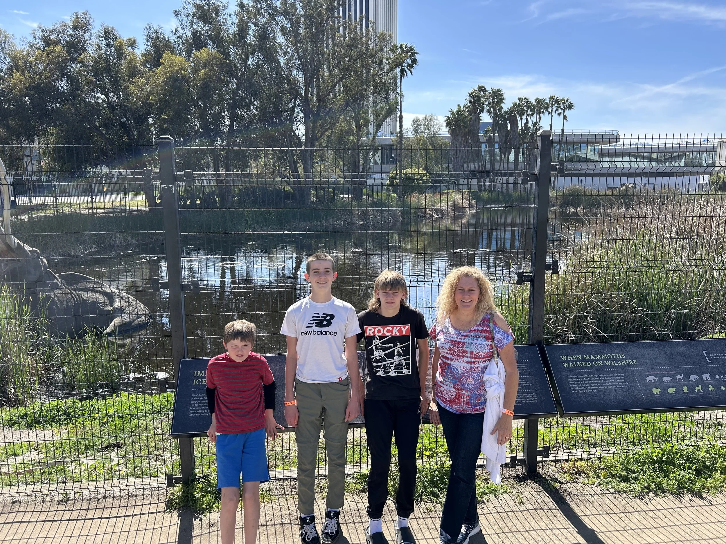 Day 3 we pushed into downtown a bit and visited LaBrea Tar Pits and Museum on our Museums 4 All pass. Very impressive archeological site. We knew it was supposed to be a big site but the scale was 10x anything we expected. As an example we learned that there were 3.5 million fossils extracted from the various tar pits, representing ~660 different species. Thousands of carnivores, which means even more prey, all landed in the sticky pit and never got out. It’s surreal visiting a lovely park with tar pits all around and modern condos and offices surrounding the skyline. A great field trip for the boys and Mom/Dad learned a lot too 🤯 We are watching the movie Volcano soon to show the boys some movie magic at the tar pits.